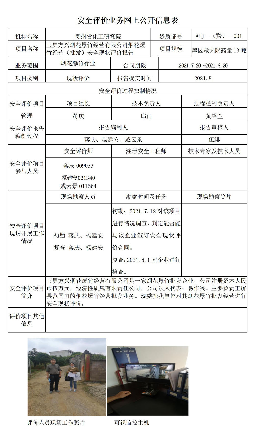 玉屏方兴烟花爆竹经营有限公司烟花爆竹经营(批发)安全现状评价报告